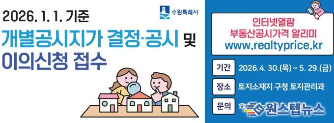 원스텝뉴스 이병희 기자 | 수원시 영통구는 2026년 1월 1일 기준 개별공시지가를 4월 30일 결정·공시하고, 5월 29일까지 이의신청 기간을 운영한다.