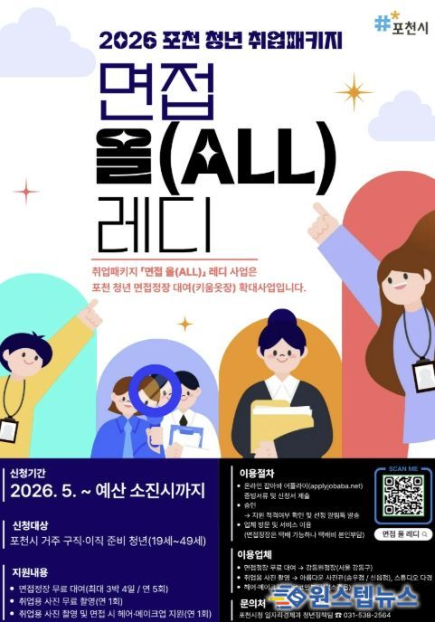 원스텝뉴스 이병희 기자 | 포천시는 구직 및 이직을 준비하는 청년들의 취업 준비 부담을 낮추고 취업 경쟁력을 높이기 위해 오는 5월 2일부터 2026 포천 청년 취업패키지 ‘면접 올(ALL) 레디’ 사업을 운영한다.