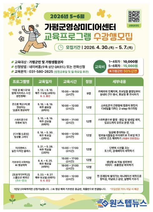 원스텝뉴스 이병희 기자 | 가평군영상미디어센터가 군민들의 영상 미디어 콘텐츠 역량 강화를 위해 ‘5~6월 미디어 교육 프로그램’ 수강생을 4월 30일부터 선착순으로 모집한다.