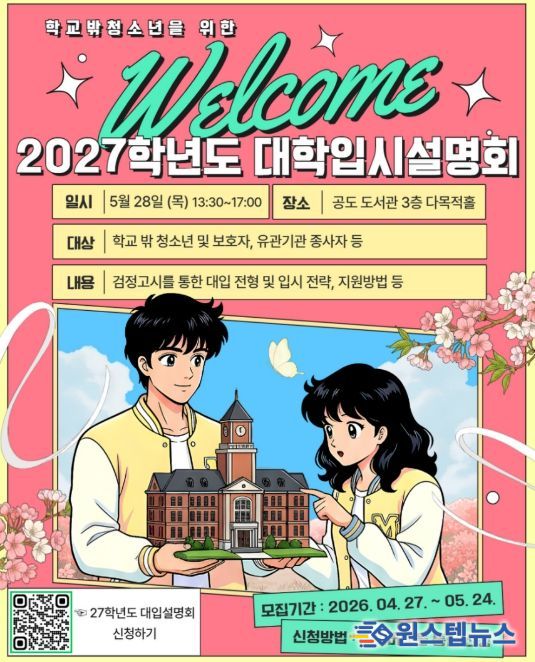 원스텝뉴스 이병희 기자 | 안성시학교밖청소년지원센터는 학교 밖 청소년의 성공적인 진학을 돕기 위해 오는 5월 28일 오후 1시 30분부터 공도 도서관 다목적홀에서 ‘2027학년도 대학 입시 설명회’를 개최한다고 밝혔다.