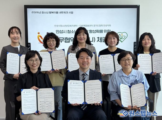 원스텝뉴스 이병희 기자 | 안성시청소년상담복지센터는 지난 27일 안성맞춤공감센터에서 다함께돌봄센터 경기도협의회 안성지회와 청소년의 건강한 성장과 복지 증진을 위한 업무협약(MOU)을 체결했다.