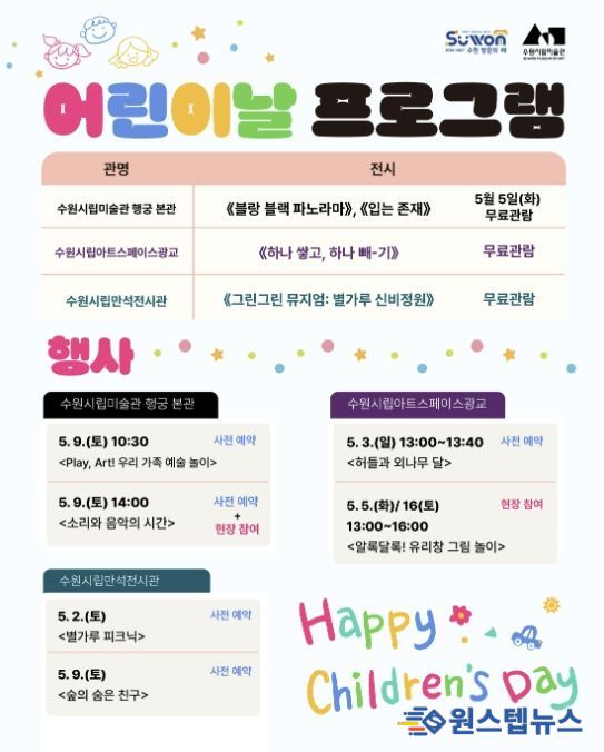 원스텝뉴스 천규영 기자 | 경기도 수원시립미술관은 2026년 어린이날을 맞아 수원시립미술관 행궁 본관, 수원시립아트스페이스광교, 수원시립만석전시관에서 즐거운 하루를 보낼 수 있는 전시와 다양한 프로그램을 운영한다.