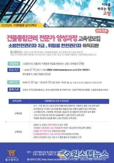 원스텝뉴스 이병희 기자 | 고양특례시는 중장년과 청년 미취업자의 재취업을 지원하는 2026년 고양맞춤형 일자리학교의 일환으로, ‘건물종합관리 전문가 양성과정’에 참여할 교육생을 모집한다고 29일 밝혔다.