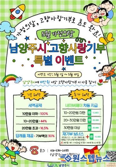 원스텝뉴스 이병희 기자 | 남양주시는 가정의 달을 맞아 5월 1일부터 10일까지 고향사랑기부 특별선물 증정 이벤트를 추진한다고 30일 밝혔다.