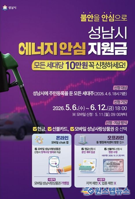 원스텝뉴스 이병희 기자 | 성남시는 중동 사태에 따른 국가 자원안보 위기 경보 발령으로 경제적 부담이 커진 시민들을 지원하기 위해 전국 최초로 ‘성남시 에너지 안심지원금’을 오는 5월 6일부터 신청을 받는다고 밝혔다.
