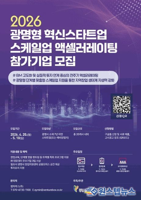 시는 오는 5월 10일까지 ‘2026년 광명형 혁신스타트업 스케일업 액셀러레이팅’ 참가기업을 모집한다.