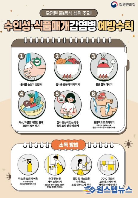 수인성ㆍ식품매개감염병은 병원성 세균, 바이러스, 원충에 오염된 물이나 식품을 섭취해 구토, 설사, 복통 등의 장관 증상을 유발한다. 이를 예방하기 위해서는 ▲올바른 손 씻기 생활화 ▲음식 충분히 익혀 먹기 ▲물 끓여 마시기 ▲채소ㆍ과일 깨끗한 물에 충분히 씻어 먹기 ▲설사 증상 시 음식 조리 및 준비 금지 ▲위생적으로 조리하기 등 예방수칙을 준수해야 한다.