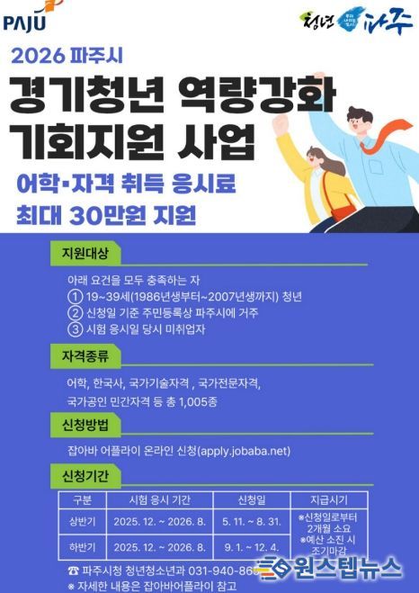 원스텝뉴스 이병희 기자 | 파주시는 청년들의 취업 준비 비용 부담을 낮추고 고른 취업 기회 제공을 위해, 미취업 청년에게 어학·자격시험 응시료를 최대 30만 원까지 지원하는 ‘경기청년 역량강화 기회지원’사업을 추진한다.
