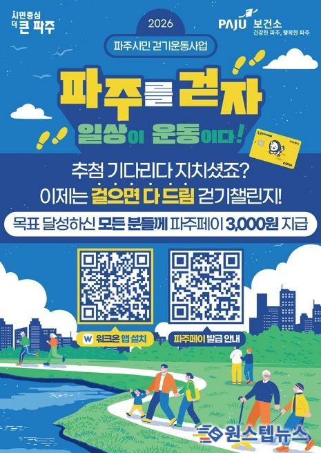 원스텝뉴스 이병희 기자 | 파주시는 시민 건강 증진과 지역 경제 활성화를 위해 모바일 걷기 앱 ‘워크온 걷기 챌린지’특전(인센티브) 지급 방식을 전면 개편하고, 5월부터 시행한다.