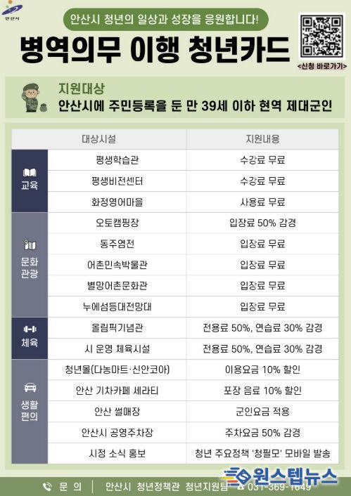 원스텝뉴스 이병희 기자 | 안산시는 병역의무를 성실히 이행한 청년들을 위해 운영 중인 ‘병역의무 이행 청년카드’의 혜택을 오는 5월부터 대폭 확대한다고 30일 밝혔다.