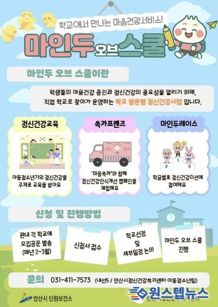 원스텝뉴스 이병희 기자 | 안산시 정신건강복지센터는 11월까지 관내 초·중·고등학교 총 10개교를 대상으로 학교로 찾아가는 정신건강사업 ‘마인두 오브 스쿨’을 운영한다고 30일 밝혔다.