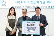 원스텝뉴스 이병희 기자 | 안양시는 지난 29일 ㈜미미로부터 이웃돕기 성금 1천만원을 기탁받았다고 30일 밝혔다. 이날 시청 접견실에서 열린 성금 전달식에는 최대호 안양시장과 조인주 ㈜미미 회장, 조예서 전무 등이 참석했다. ㈜미미는 만안구 덕천로에 소재한 기업으로 용역·청소·경비·주택업·건물종합관리 등 다양한 분야에서 사업을 운영하고 있으며, 지역사회 나눔과 사회공헌 활동에도 꾸준히 동참하고 있다. 이번에 기탁된 성금은 안양시 이웃돕기 성금으로 사용되며, 저소득층 건강보험료 지원과 취약계층 물품 지원 등 관내 어려운 이웃을 돕는 데 활용될 예정이다. 조인주 회장은 “지역사회로부터 받은 사랑을 다시 이웃과 나누고자 성금을 기탁하게 됐다”며 “작은 정성이지만 어려운 분들께 도움이 되기를 바란다”고 전했다. 최대호 안양시장은 “연말을 맞아 따뜻한 나눔을 실천해 주셔서 감사드린다”면서 “성금은 저소득층과 취약계층 등 도움이 절실한 이웃들에게 투명하고 공정하게 전달하겠다”고 말했다.