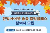 원스텝뉴스 이병희 기자 | 파주보건소는 시민들의 건강한 삶을 위한 한의약 건강 증진 프로그램인 ‘한방이어락(樂) 숲속 치유교실(힐링 클래스)’을 오는 25일 10시부터 12시까지 율곡수목원에서 운영한다. 이번 프로그램은 자연 속에서 가족이 함께 건강을 되돌아보고, 숲에서의 명상과 호흡을 통해 스트레스를 해소하고자 기획됐다. 참가자들은 수목원의 맑은 공기와 아름다운 풍경 속에서 지친 몸과 마음을 회복하는 시간을 갖게 된다. 주요 내용은 ▲구절초 숲길 산책 ▲자연 속에서 가족과 추억 만들기 ▲구절초 차 마시기 등 구절초를 주제로 한 다양한 활동으로 구성되어 있다. 신청은 파주시 평생교육포털 누리집(lll.paju.go.kr)을 통해 가능하며, 가족 단위로(4~6가구, 총 20여 명) 선착순 모집한다. 단, 신청 가구가 많을 경우 3대 가족을 우선 선발한다. 이한상 파주보건소장은 “자연과 함께하는 치유 프로그램을 통해 가족 간 유대감을 높이고, 건강한 생활 습관을 기를 수 있는 계기가 되길 바란다”라며 “많은 시민들의 적극적인 참여를 기대한다”라고 밝혔다.