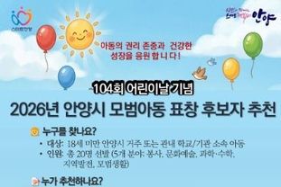 원스텝뉴스 이병희 기자 | 안양시는 어린이날을 맞아 다양한 분야에서 모범이 되는 아동을 발굴하기 위해 ‘2026년 모범아동 유공 표창’ 후보자를 11일부터 25일까지 추천받는다고 11일 밝혔다. 추천 대상은 공고일(11일) 기준 안양시에 주민등록이 되어 있거나, 관내 학교·기관·단체에 소속(재학)된 18세 미만 아동이다. 단, 형사처벌·교내 징계처분을 받았거나, 교내 징계 절차가 진행 중인 경우는 제외된다. 시는 ▲봉사활동 실적 우수 4명 ▲문화예술 분야 우수 2명 ▲과학(수학)·기술 분야 우수 2명 ▲지역사회 발전 유공 4명 ▲모범 생활 8명 등 5개 분야에서 총 20명의 모범아동을 선발할 계획이다. 후보자 추천은 소속 학교장 또는 활동 관련 기관·단체장이 할 수 있다. 추천서와 공적조서 등 관련 서류를 구비해 오는 25일 오후 6시까지 안양시청 6층 아동과 아동친화팀에 방문 또는 우편으로 제출하거나 이메일로 접수하면 된다. 시는 접수된 후보자를 대상으로 인성과 리더십 등 분야별 기준에 따라 공적심사위원회의 심사를 거쳐 4월 중 최종 수상자를 발표할 예정이다. 표창은 오는 5월 5일 어린이날 기념