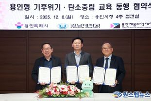 원스텝뉴스 이병희 기자 | 용인특례시는 8일 시청 접견실에서 강남대학교, 용인예술과학대학교와 ‘용인형 기후위기·탄소중립 교육 동행 협약’을 체결했다. 이날 협약식은 기후위기에 공동으로 대응하고, 지속가능한 지역사회 발전과 미래 세대 양성을 위해 마련됐다. 협약의 주요 내용은 ▲탄소중립‧기후 위기 대응 교육프로그램 공동 개발‧운영 ▲교육봉사‧멘토링 등 교원‧전문가‧학생 간 교류와 연계 활동 지원 ▲지역사회 대상 탄소중립 홍보‧캠페인‧체험 교육 공동 추진 ▲교육시설‧인프라 상호 활용 등이다. 협약에 따라 시와 두 대학은 탄소중립 사회 실현을 위한 교육 모델을 구축한다는 방침이다. 각 대학의 유아교육과 인력과 연계해 교육봉사 기회를 확대하고, 신규 프로그램을 공동 개발해 용인지역 학생들을 탄소중립 실천 의지를 가진 인재로 육성하고, 시민의 환경 감수성을 높이는 데도 이바지하겠다는 계획이다. 이에 따라 오는 12일 용인예술과학대 유아교육과 연극동아리가 기후변화체험교육센터에서 아동 30명을 대상으로 관련 연극을 진행한다. 이상일 시장은 “기후 위기는 글로벌 차원의 가장 중대한 문제인