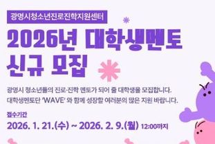 원스텝뉴스 이병희 기자 | 광명시청소년재단 청소년진로진학지원센터는 관내 중·고등학교 청소년 대상 학과 멘토링 운영을 위해 ‘2026년 대학생 멘토단(wave)’을 모집한다고 밝혔다. 대학생 멘토단(wave)은 대학생 멘토가 전공 및 진로 경험을 바탕으로 청소년에게 학과 정보, 전공 이해, 진학 준비 방향 등을 제공하는 프로그램으로, 학교 현장과 연계한 멘토링 활동을 통해 청소년의 진로·진학 역량 강화를 지원한다. 모집 대상은 4년제 대학교 재학생·휴학생 또는 대학원 재학생·휴학생(2026학년도 입학 예정자 포함)으로, 1년 이상 활동 가능한 대학생이면 지원할 수 있다. 선발된 멘토에게는 역량강화 교육이 제공되며, 멘토링 활동 참여 시 소정의 활동비 지급 또는 봉사시간 인정 등 참여 혜택이 지원된다. 신청은 2026년 2월 9일 12:00까지 구글폼을 통해 가능하며, 자세한 사항은 광명시청소년진로진학지원센터 홈페이지 내 모집 공고문을 통해 확인할 수 있다. 광명시청소년진로진학지원센터 박사라 센터장은 “이번 멘토단 운영을 통해 청소년에게는 실질적인 진학 정보와 멘토링 기회를 제공하고, 대학생에게는 지역