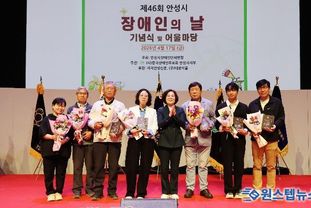 원스텝뉴스 이병희 기자 | 안성시는 17일, 안성맞춤랜드 남사당공연장에서 장애인에 대한 인식 개선과 화합의 장 마련을 위해 ‘제46회 장애인의 날 기념행사’를 개최했다고 밝혔다. 안성시장애인단체 연합 주최로 열린 이날 행사는 장애인과 가족, 관계자 등 1천여 명이 참석한 가운데 식전 오케스트라 공연을 시작으로 1부 기념식과 2부 어울마당 순으로 진행됐다. 특히 이번 행사는 ‘당연한 일상, 모두가 누릴 수 있도록’ 이라는 슬로건 아래, 장애인이 일상에서 차별 없이 살아갈 수 있는 사회환경 조성의 중요성을 되새기는 자리로 의미를 더했다. 1부 기념식은 장애인인권헌장 낭독, 대회사, 축사 등이 진행됐으며 모범장애인과 장애인 복지 증진에 기여한 유공자 38명에 대한 표창 및 감사패 수여로 그간의 노고를 격려하는 시간을 가졌다. 2부 어울마당에서는 장애인단체가 준비한 공연과 장기 자랑, 행운권추첨 등 다채로운 프로그램이 진행돼 참석자 모두가 함께 즐기고, 서로 간의 격려와 응원이 이어지는 따뜻한 분위기가 형성됐다. 시 관계자는 “같이의 가치가 어느 때보다 중요한 요즘, 오늘 이 자리가 서로를 이