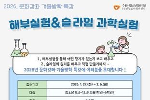 원스텝뉴스 이병희 기자 | 수원시청소년청년재단 권선청소년청년센터는 겨울방학 기간 동안 단회기 체험 중심의 특강을 운영하여 청소년에게 다양한 문화 활동의 기회를 제공하고자 2026년 문화강좌 겨울방학특강 수강생을 모집한다. 이번 청소년 겨울방학특강은 초등학생 눈높이에 맞춘 실험·탐구 중심 수업으로 구성되어, 어렵게 느껴질 수 있는 과학 개념을 쉽고 재미있게 이해할 수 있도록 돕는다. 권선청소년청년센터 관계자는“겨울방학 동안 아이들이 의미 있는 시간을 보낼 수 있도록 과학을 놀이처럼 즐길 수 있는 수업을 준비했다”며 “방학기간 동안 과학에 대한 흥미를 높이고, 체험 중심의 수업을 통해 창의적 사고력과 탐구 능력을 키우는 계기가 되길 바란다”고 전했다. 한편, 권선청소년청년센터 문화강좌 겨울방학특강은 2월 10일부터 12일까지 3회기로 진행되며 수원지역 초등학생을 대상으로 한다. 자세한 내용 및 신청 방법은 홍보지를 통해 확인할 수 있다.
