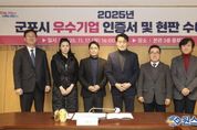 원스텝뉴스 이병희 기자 | 군포시는 17일 시청 3층 중회의실에서 ‘2025년 군포시 우수기업 인증서 및 현판 수여식’을 열고 5개 우수기업에 인증서와 현판을 수여했다. ‘우수기업 선정사업’은 2022년부터 시작하여 올해 4번째로 추진하는 사업으로 일자리 창출, 세수 증대 등 지역경제 활성화에 기여한 기업을 선정하여 인센티브를 부여하는 사업이다. 선정된 우수기업은 인증기간(3년) 동안 군포시 중소기업 육성자금 지원 시 추가 이차보전, 군포시 관내 공영주차장 이용 시 주차요금 감면, 협약병원 의료비 지원 등의 인센티브가 부여된다. 하은호 군포시장은 “어려운 경제 상황 속 관내 우수한 기업에 활력을 불어넣기 위한 우수기업 선정사업에 관심 가져주심에 감사드리며, 앞으로도 기업지원 사업을 다각화하여 기업 경영하기 좋은 환경을 만들겠다”고 말했다. 올해 선정된 군포시 우수기업은 △(주)아이씨에이치 △㈜지비티코리아 △주식회사예선테크 △듀라텍 주식회사 △㈜트리플닷 으로 총 5개 기업이다.