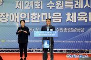 원스텝뉴스 이병희 기자 | 수원특례시의회는 9일, 수원실내체육관에서 열린 ‘제21회 수원특례시 장애인 한마음 체육대회 개회식’에 참석해 선수단을 격려했다. 이날 행사에는 이재식 의장을 비롯한 수원특례시의회 의원, 수원시장애인체육회와 수원시장애인복지단체연합회 관계자, 선수 400여 명과 보호자, 심판 등이 함께해 대회의 열기를 더했다. 이재식 의장은 축사를 통해 “이번 대회는 누가 더 잘하느냐의 경쟁보다 함께 뛰고 웃으며 서로의 마음을 나누는 자리가 되길 바란다”며, “수원특례시의회는 장애인 여러분이 스포츠를 통해 도전과 열정을 마음껏 펼칠 수 있도록 지속적으로 관심을 가지고 아낌없이 지원하겠다”고 밝혔다. 한편, 이번 대회는 수원시장애인체육회와 수원시장애인복지단체연합회가 주최·주관했으며, 슐런·투호·한궁·육상·족구 등 12개 종목에서 선수들이 기량을 겨루며 화합의 장을 만들었다.