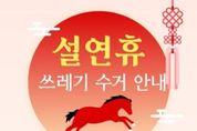 원스텝뉴스 이병희 기자 | 고양특례시 일산서구는 설 연휴 기간 주민 불편을 최소화하고 쾌적한 도시환경을 유지하기 위해 오는 14일부터 18일까지 5일간 생활폐기물 관리대책을 추진한다. 구는 ▲비상근무체계를 통한 신속한 청소행정 서비스 제공 ▲재활용품 분리배출·생활폐기물 감량 홍보 ▲연휴 기간 수거일 사전 안내 등을 실시해 올바른 쓰레기 배출을 유도할 방침이다. 이달 14일과 18일을 집중 수거일로 지정해 생활폐기물과 음식물 관련 폐기물을 정상 수거하고, 설 연휴 기간인 2월 15일부터 17일까지는 수거를 중단한다. 이에 따라 연휴 기간 중 생활쓰레기 배출 자제와 수거 일정 조정사항을 사전 홍보할 계획이다. 또한 연휴 기간, 총 17명 규모의 청소대책 상황반과 대응반을 편성·운영해 생활쓰레기 관련 민원과 무단투기 신고에 신속히 대응하고 쓰레기 투기 상습지역을 중심으로 순찰과 집중 수거를 병행한다. 구 관계자는 “설 연휴에도 주민들이 불편 없이 쾌적한 환경에서 명절을 보낼 수 있도록 청소행정 운영에 최선을 다하겠다”며 “주민들께서도 수거일을 준수하고 올바른 분리배출과 쓰레기 감량에 적극 협조해 주시길