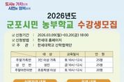 원스텝뉴스 이병희 기자 | 군포시 도시농업 활성화 지원사업 보조사업자인 한세대학교가 오는 3월 20일까지 2026년도 군포시민 농부학교 신규 수강생을 모집한다고 밝혔다. 군포시민 농부학교는 군포시민들이 도심 속에서 직접 작물을 재배하며 친환경적인 삶의 태도를 함양하고, 이웃과 소통하는 공동체 문화를 회복하기 위해 마련됐다. 특히 단순한 농사 기술 습득을 넘어 이론과 실습이 병행된 체계적인 커리큘럼을 제공할 예정이다. 올해 모집 규모는 성인반 25구좌, 주말가족반 25구좌, 주말어린이반 20구좌로 총 70구좌이며, 교육은 한세대학교 내 위치한 도시농업지원센터 전용 농장에서 진행된다. 운영 기간은 3월부터 12월까지 약 10개월간이며 총 20강에 걸쳐 절기별 작물 재배법과 생태 교육 등 다채로운 프로그램이 이어진다. 신청 접수는 3월 9일부터 3월 20일까지 진행되며 자세한 커리큘럼 및 접수 방법은 한세대학교 홈페이지 공지사항을 통해 확인할 수 있다. 군포시 관계자는 “도시농업은 먹거리를 생산하는 즐거움을 넘어 기후 위기 시대에 탄소 중립을 실천하는 소중한 발걸음이 될 것”이라며 “많은 시민이 흙을 만