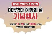 원스텝뉴스 이병희 기자 | 오산시는 오는 19일 ‘아동학대예방의 날’과 ‘아동학대예방주간’을 맞아 기념행사 및 온·오프라인 캠페인을 실시한다고 12일 밝혔다. 행사는 19일 오전 10시부터 12시까지 오산시청 대회의실에서 진행되며, ▲1부 아동학대예방의 날 기념식 식전공연, 유공자 표창 시상, 퍼포먼스, ▲2부 부모교육 특별강연으로 구성된다. 특별강연은 리플러스 인간연구소 박재연 소장이 ‘부모를 위한 건강한 대화방법’을 주제로 진행한다. 매년 11월 19일은 아동학대 예방과 방지에 대한 사회적 관심을 높이기 위해 제정된 법정기념일로, 오산시는 매년 기념식과 강연, 캠페인 등을 통해 아동학대 예방의 중요성을 알리는 다양한 활동을 추진해오고 있다. 시는 이달 25일까지 온라인 릴레이 캠페인도 함께 진행한다. 오산시민 누구나 SNS에 아동학대예방 메시지 또는 관련 사진을 업로드해 참여할 수 있다. 또한 11월 24일에는 시청 인근 주요 교차로에서 시민 대상 오프라인 홍보 캠페인을 실시해 아동학대 예방 인식 제고에 나설 예정이다. 박현주 아동복지과장은 “이번 행사가 아동학대 예방의 중요성을 되새기고 아이들