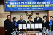원스텝뉴스 이병희 기자 | 여수시의회는 27일 오후 3시 순천시의회 의장실에서 강형구 순천시의회 의장, 최대원 광양시의회 의장과 함께 '전남·광주 행정통합에 따른 전남동부권(여수·순천·광양) 미래경제동맹 공동선언문'을 발표했다. 이번 공동선언은 전라남도와 광주광역시의 행정통합 논의가 진행되는 가운데, 전남동부권이 국가 산업·에너지·물류 거점으로서 수행해 온 역할과 향후 기능이 통합 과정에서 반드시 반영돼야 한다는 데 3개 시의회 의장이 뜻을 모으며 마련됐다. 3개 시의회 의장은 공동선언을 통해 전남·광주 행정통합이 수도권 일극체제 완화와 국가균형발전을 위한 계기가 돼야 하며, 단순한 행정구역 개편을 넘어 산업·교통·에너지·물류·인재 정책을 연계하는 초광역 경제권 형성으로 이어져야 한다는 점을 강조했다. 아울러 행정통합 이후 정책과 재정, 대규모 국책사업이 광주권과 전남 서부권에 집중될 가능성에 대해 우려를 표하며, 전남동부권의 산업적 위상과 기능이 통합 논의 전반에 균형 있게 반영돼야 한다는 입장을 분명히 했다. 여수·순천·광양 3개 시의회 의장은 공동선언을 통해 ▲전남동부권의 국가산업 거점 기능과
