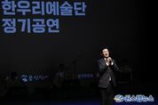 원스텝뉴스 천규영 기자 | 용인특례시는 5일 오후 수지구 용인평생학습관 큰어울마당에서 ‘한우리예술단 정기공연’이 열렸다고 6일 밝혔다. 용인특례시가 후원하고 용인민예총이 주최·주관한 이날 행사는 우리 고유의 가락과 춤을 한자리에서 만날 수 있는 전통 공연으로 꾸며졌고, 이상일 시장은 1시간 40분간 진행된 공연을 끝까지 지켜본 뒤 공연단을 격려했다. 공연은 농악, 민요, 가야금, 검무 등으로 우리 민족 고유의 소리와 정서, 삶의 이야기를 그려내 큰 박수갈채를 받았다. 할미성 농악 보존회는 꽹과리, 장구, 북, 징, 태평소 등의 악기를 활용해 역동적인 농악 판굿을 선보였다. 용인 아리랑 보존회는 청춘가, 태평가, 창부타령 등 흥겨운 경기민요를 열창하며 분위기를 이끌었다. 이어 검무가 남지연씨의 검무공연이 펼져졌다. 앙상블 더 가야금은 대중에게 친숙한 고향의 봄, 꽃타령, 까투리타령 등을 가야금 병창으로 들려주며 국악의 매력을 선사했다. 한우리예술단은 화려한 가락이 돋보이는 설장구로 타악의 진수를 보여줬다. 이상일 시장은 축사에서 “올해로 32회를 맞이