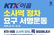 원스텝뉴스 이병희 기자 | 부천시는 서해선 KTX-이음 열차의 소사역 정차를 추진하기 위해 10만 서명운동을 시작했다. 이번 서명운동은 12월 19일까지 진행되며, 관내 시민과 인천·서울 서남권 주민의 광역철도 접근성을 높이고, 지역 산업과 관광 활성화를 통한 경제적 효과를 목표로 추진된다. 온라인 서명운동은 큐알(QR)코드와 부천시 홈페이지를 통해 참여할 수 있다. 오프라인 서명운동은 시청과 원미구·소사구·오정구청, 각 동 행정복지센터 민원실을 비롯해 소사역, 부천시청역 등 주요 전철역과 아파트 단지 등 시민 접근이 쉬운 장소에서 진행된다. 이와 함께 시는 이번 서명운동에 시민과 지역 단체, 학교 등 다양한 주체가 참여할 수 있도록 적극적인 홍보활동도 병행할 계획이다. 특히‘서해선 KTX-이음 소사역 정차’의 필요성과 지역 발전 효과를 널리 알리기 위해 소셜네트워크서비스(SNS), 지역 축제 현장 캠페인 등을 통해 적극적으로 홍보할 예정이다. 조용익 부천시장은 “KTX-이음 소사역 정차는 단순한 교통 개선을 넘어, 서해선 시대에 부천이 수도권 서남부의 중심으로 도약할 수 있는 계기”라며 “시민의