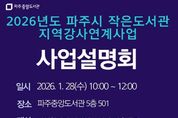 원스텝뉴스 이병희 기자 | 파주시 중앙도서관은 지역의 작가, 예술가, 독서문화 활동가 등 인재를 발굴해 작은도서관의 독서문화 프로그램을 지원하는 녪년 작은도서관 지역강사 연계사업’에 참여할 지역강사를 모집한다. ‘작은도서관 지역강사 연계사업’은 2021년부터 추진하여 시민들이 작은도서관에서 지역의 작가, 예술가, 독서문화 활동가와 만나 다양한 독서문화 활동을 체험할 수 있도록 지원해 온 인기 사업이다. 특히 2025년에는 약 1,200명의 시민이 참여해 독서문화 확산과 작은도서관 운영 활성화에 크게 기여했다. 오는 28일 10시 중앙도서관에서 참여하고자 하는 강사들을 위해 모집 전 ‘강사 사업설명회’를 개최한다. 설명회에서는 사업 취지와 신청서 작성방법 등을 설명하여, 지역 작가, 예술가, 독서문화 등 다양한 역량을 가진 강사가 참여할 수 있도록 안내할 예정이다. 2026년도 지역강사 연계사업에 참여하여 강사로 활동하고자 하는 인재들은 오는 29일부터 2월 10일까지 신청서를 작성해 제출하면 된다. 또한, 2월 26일에는 서류심사를 통과한 강사를 대상으로 박람회 형식의 프로그램 설명회인 ‘지역강사박
