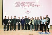 원스텝뉴스 천규영 기자 | 포천시는 지난 1일 시청 대회의실에서 제23회 포천시민의 날을 기념해 2025년 한 해 동안 지역 발전에 기여한 유공자들을 대상으로 표창 수여식을 개최했다. 이날 행사에는 백영현 시장을 비롯해 임종훈 포천시의회 의장, 김용태 국회의원을 대신한 김길주 사무국장과 수상자 등 100여 명이 참석해 자리를 빛냈다. 올해 표창은 △경기도지사 표창 8명 △포천시장 표창 65명 △포천시의회 의장 표창 14명 △국회의원 표창 14명 등 총 101명에게 수여했다. 수상자들은 지역사회 봉사, 문화·체육 진흥, 농업 발전, 지역경제 활성화 등 다양한 분야에서 묵묵히 헌신한 공로를 인정받았다. 백영현 포천시장은 “포천의 오늘을 있게 한 주인공은 바로 시민 여러분”이라며, “각자의 자리에서 보여주신 헌신 덕분에 포천이 함께 성장하는 희망의 도시로 나아갈 수 있었다. 앞으로도 모두가 행복한 도시를 만들기 위해 최선을 다하겠다”고 말했다. 한편, 제23회 포천시민의 날 기념 행사는 10월 12일 포천종합운동장에서 열릴 예정이다.
