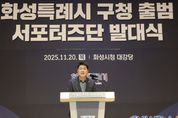 원스텝뉴스 이병희 기자 | 화성특례시의회는 20일, 화성시청 대강당에서 열린 ‘화성특례시 구청 출범 서포터즈단 발대식’에 참석해 시민과 함께하는 새로운 구청 체제 출범 준비의 의미를 공유했다. 이날 발대식에는 배정수 의장을 비롯해 시민 서포터즈단 등 총 330여 명이 자리했으며, 2026년 2월 화성특례시 4개 구청 신설을 앞두고 시민참여 기반을 다지는 공식적인 출범 행사로 마련됐다. 이번 행사는 ▲개회 및 국민의례 ▲구청 추진 경과 공유 ▲서포터즈 역할 안내 ▲구별 시민 대표 8명에 대한 위촉장 수여 ▲서포터즈단 소감 발표 ▲구청 체제 오리엔테이션 등으로 진행됐다. 특히 ‘2040 도시기본계획으로 보는 화성의 미래’, ‘도시비전 트렌드와 시민참여의 의미’ 등 전문 강연을 통해 향후 구청 체제가 지역행정과 생활에 가져올 변화가 소개되며 시민 호응을 얻었다. 배정수 의장은 “구청 출범은 시민이 체감할 수 있는 밀착형 생활행정의 본격적인 시작”이라며 “300명의 시민 서포터즈단이 지역의 요구와 비전을 현실적 정책으로 연결하는 핵심 주체가 될 것”이라며 축하했다. 한편, 서포터즈단은 2025