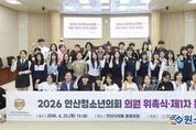 원스텝뉴스 이병희 기자 | 안산청소년의회가 지난 23일 열린 ‘2026 안산청소년의회 의원 위촉식’과 ‘안산청소년의회 제1차 본회의’를 시작으로 본격적인 활동에 들어갔다. 안산청소년의회는 시의회와 안산교육지원청, 안산시청소년재단이 지난 2024년부터 공동 운영하는 지역 청소년 참여형 활동 프로그램으로, 이번 위촉식과 제1차 본회의는 의회가 주관했다. 이날 의회 본회의장에서 의회 박태순 의장과 현옥순 의회운영부위원장과 황은화 의원, 안산교육지원청 김수진 교육장, 안산시청소년재단 전희일 대표 등이 참석한 가운데 진행된 위촉식에서는 지역 초등학생 11명과 중학생 13명, 고등학생 8명 등 총 32명이 청소년의원으로 위촉됐다. 이들 청소년의원은 지난 3월 20일부터 30일까지 학교별 접수를 거쳐 높은 경쟁률을 뚫고 선발됐다. 이어진 청소년의회 제1차 본회의에서는 청소년의회 의장·부의장 선거가 실시됐다. 총 16명의 청소년의원들이 의장과 부의장 후보로 나서서 정견을 발표했고 투표 결과, 의장에는 정예준 청소년의원이, 중등 부의장에는 김민서 청소년의원이, 초등 부의장에는 박가윤 청소년의원이 각각